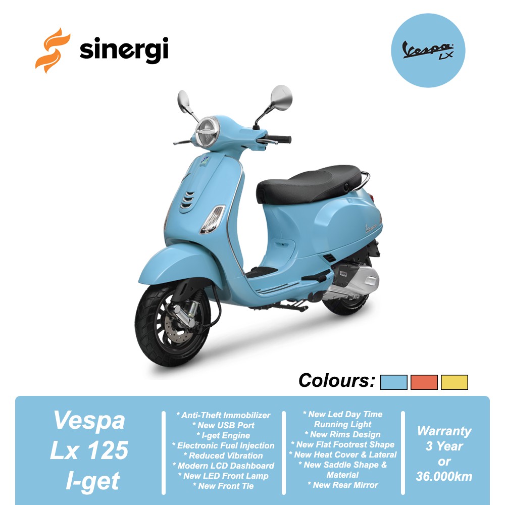 Simulasi Kredit Motor Vespa Matic 2022 - Berita Otomotif ... Dengan spesifikasi tersebut, Vespa LX 125 mampu menghasilkan tenaga maksimum 7,6 kW @ 7.600 rpm dan torsi maksimum 10,2 Nm @ 6.000 rpm. Ada tiga varian warna untuk model ini, yaitu Blue Capri, Orange Corallo, dan Yellow Lime. Harga OTR Jakarta: Rp38.700.000