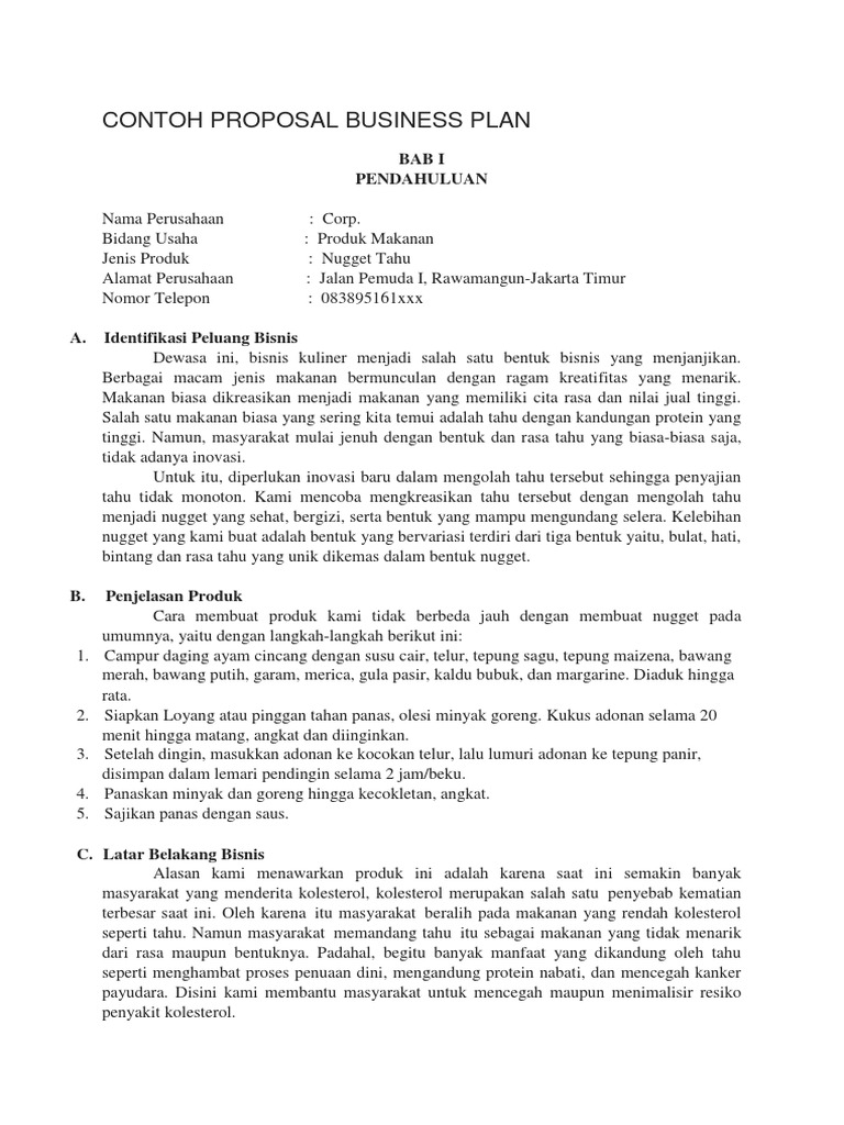 8 Contoh Proposal Penawaran Produk Sederhana dan Cara ... Contoh Proposal Usaha Makanan Ringan Sederhana yang Baik dan Benar 2. Mencantumkan Profil dari Perusahaan Langkah selanjutnya yang perlu dilakukan yaitu dengan membuat profil dari perusahaan yang disusun secara padat dan jelas. Profil ini hanya perlu untuk mencantumkan informasi dasar seperti nama perusahaan, jenis usaha, dan lokasi kantornya. Contoh Proposal Bisnis Plan Makanan Sederhana | My Skripsi Contoh Proposal Bisnis Plan Makanan Sederhana - Jadi menggunakan banner dekat lokasi. Profil Perusahaan Catering 2020 PPT. Langkah pertama tentu saja harus membuka lembar ms. Contoh proposal bisnis plan makanan sederhana. Contoh bisnis plan Makanan Unik. Contoh bisnis plan sederhana untuk mahasiswa juga berisi tentang unsur-unsur yang ada dalam ... (DOC) Contoh Business Plan Sederhana - Choco Crunchy ... Salah satu contoh camilan yang sesuai yaitu pisang goreng. 4.1.2 Permintaan Selain untuk mengenyangkan perut, konsumen biasanya melirik produk cemilan dengan harga murah. Contoh Bisnis Plan Makanan Sederhana Dan Lengkap Contoh Bisnis Plan Makanan, Unik dan Kekinian Pebisnis yang baik harus mampu merencanakan sekaligus mengeksekusi bisnisnya dengan baik. Dalam pembuatan rancangan bisnis, harus ada latar belakang, tujuan, dan deskripsi produk. Berikut contoh bisnis plan makanan, unik dan kekinian yang bisa Anda jadikan rekomendasi membangun bisnis makanan.