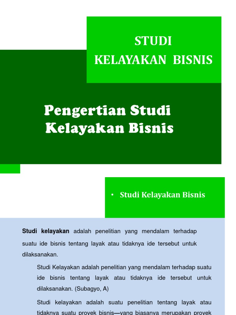 (PPT) study kelayakan bisnis.ppt | Kadek Agus - Academia.edu STUDI KELAYAKAN USAHA 1. Pentingnya Studi Kelayakan Usaha Studi Kelayakan usaha/bisnis disebut juga analisis proyek bisnis yaitu suatu penelitian tentang layak tidaknya suatu bisnis dilaksanakan dengan menguntungkan secara terus menerus fHasil studi kelayakan usaha pada prinsipnya bisa digunakan untuk : 1. Untuk merintis usaha baru 2.