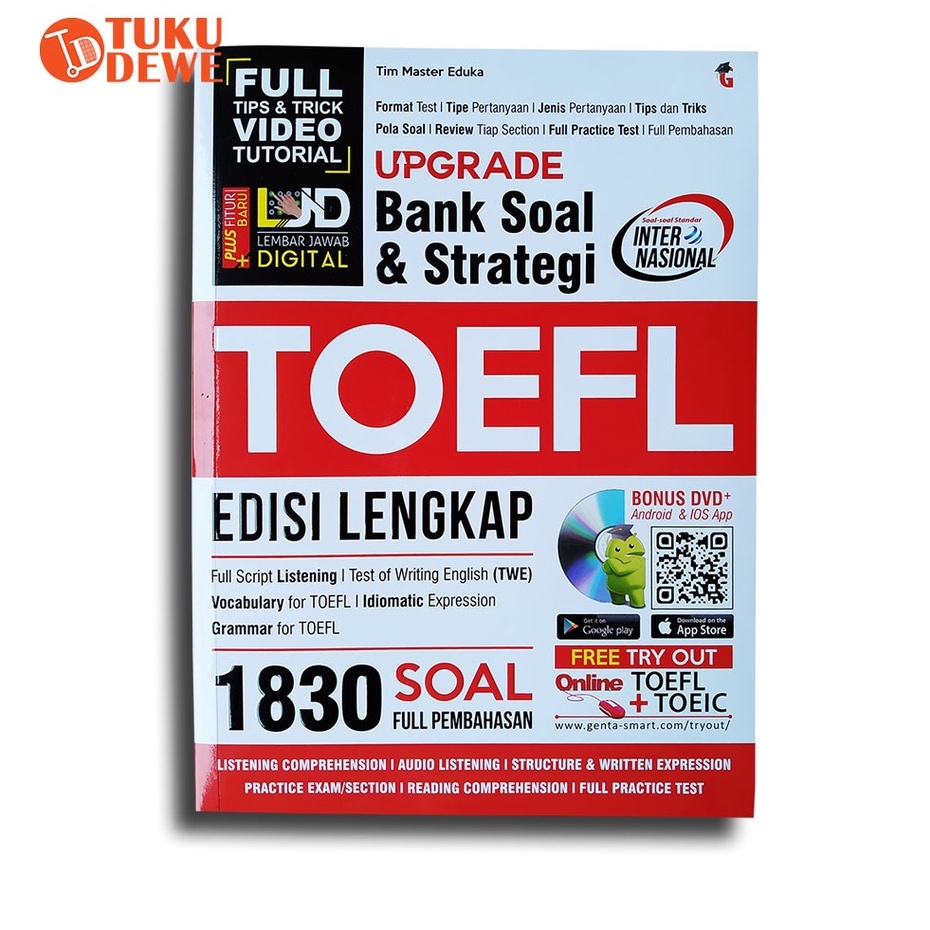 Genta Smart Publisher (Bank Soal Dan Strategi TOEFL) Buku ini memuat 1.830 soal TOEFL standar ETS beserta pembahasannya yang terdiri dari: CD Simulasi TOEFL 4 Paket Materi Lengkap TOEFL Listening Comprehension, Structure & Written Expression Reading Comprehension Test of Written English Grammar Overview Exercise dan Problem Solving Vocabulary in TOEFL Idiomatic Expression Kumpulan soal TOEFL dan pembahasannya download pdf ... download kumpulan soal toefl dan pembahasan, listening, structure, reading, writing. Bank soal dari berbagai buku toefl yang dapat didownload berupa file pdf doc zip yang disertai audio listening