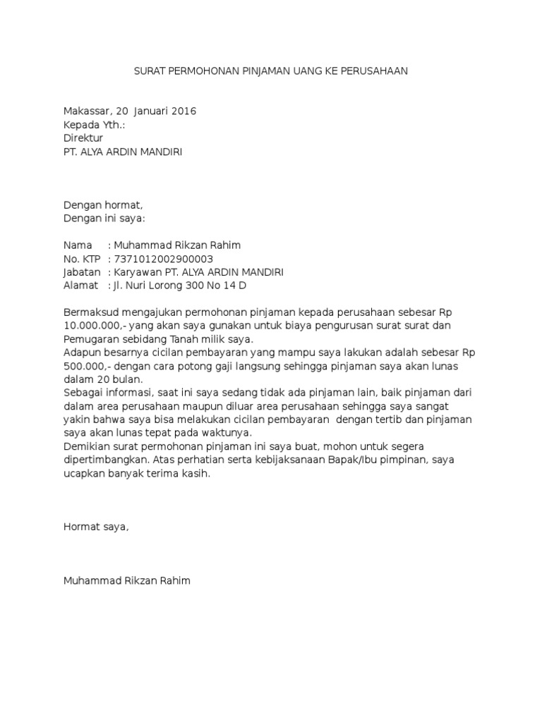 Contoh surat pinjaman uang ke perusahaan. Contoh Surat Perjanjian Pinjaman Uang | Rumah.com Contoh surat perjanjian pinjaman uang bisa menjadi bekal Anda di kemudian hari. Sumber: Flickr Melakukan pinjaman uang bisa Anda ajukan kepada badan yang kompeten. Misalnya ke perusahaan tempat Anda bekerja, pinjaman uang online yang resmi terdaftar di OJK, atau lembaga pembiayaan yang terpercaya. Contoh Surat Pinjaman Uang ke Perusahaan - Contohsurat Contoh Surat Pinjaman Uang ke Perusahaan. Contoh Surat Pinjaman Uang ke Perusahaan yang benar sebagai referensi dalam membuat surat pinjaman uang dengan baik dan benar serta profesional. Download. Info Lengkap : Contoh Surat Pinjaman Uang yang Benar. pinjaman ke perusahaan, pinjaman pribadi, pinjaman uang, surat pinjaman. Contoh Surat Permohonan Pinjaman Uang Ke Perusahaan | PDF SURAT PERMOHONAN PINJAMAN UANG KE PERUSAHAAN. Makassar, 20 Januari 2016 Kepada Yth.: Direktur PT. ALYA ARDIN MANDIRI. Dengan hormat, Dengan ini saya: Nama No. KTP Jabatan Alamat Muhammad Rikzan Rahim Contoh Surat Perjanjian Hutang Piutang & Pelunasannya ... Contoh Surat Perjanjian Hutang Piutang - Persoalan utang-piutang bukanlah hal yang asing dalam kehidupan kita sehari-hari. Banyak orang yang terpaksa melakukan proses hutang demi memenuhi kebutuhan hidup mereka. Hutang tersebut dapat diperoleh dari perseorangan maupun dari pihak instansi seperti bank.