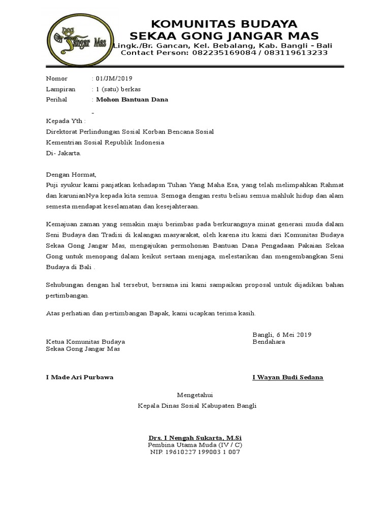 6 Contoh Proposal Pengajuan Dana untuk Berbagai Keperluan ... Demikianlah surat proposal pengajuan dana ini saya buat. Semoga dapat dijadikan pertimbangan oleh bapak/ibu, demi mendukung terlaksananya kegiatan kami. Terima kasih. Baca Juga: 10 Contoh Surat Resmi yang Bisa Dijadikan Sebagai Panduanmu. Jadi, itulah beberapa contoh proposal pengajuan dana untuk berbagai kegiatan. CONTOH PROPOSAL PENGAJUAN DANA pdf yang Benar Berikut ada 6 contoh proposal pengajuan dana baik untuk kegiatan maupun usaha: Contents [ hide] 1. Contoh Proposal Pengajuan Dana Kegiatan Lomba 2. Contoh Proposal Pengajuan Dana untuk Usaha 3. Contoh Proposal Pengajuan Dana Ke Perusahaan 4. Contoh Proposal Pengajuan Dana Kegiatan Organisasi 5. Contoh Proposal Pengajuan Dana Kegiatan Sekolah 6. Contoh Surat Permohonan Bantuan Dana Kegiatan Organisasi ... Berikut ini admin berikan contoh proposal pengajuan dana kegiatan organisasi pdf sederhana. 001/ra.ds/ii/2020 perihal permohonan bantuan dana hibah / bansos provinsi banten selaku . Yuk, pelajari contoh surat permohonan bantuan dana yang baik dan benar berikut ini! 3 Contoh Proposal Pengajuan Dana dan Tips Cara Membuatnya Apr 13, 2022 · Nggak heran, dengan adanya proposal pengajuan dana kadang membuat suatu kelompok atau individu yang sedang menyusun rencana atau kegiatan bisa terus bertahan dan berupaya agar kegiatannya sesuai dengan harapan. Biasanya, pada proposal pengajuan dana terdapat beberapa bagian penting seperti berikut. Latar Belakang. Maksud dan Tujuan.